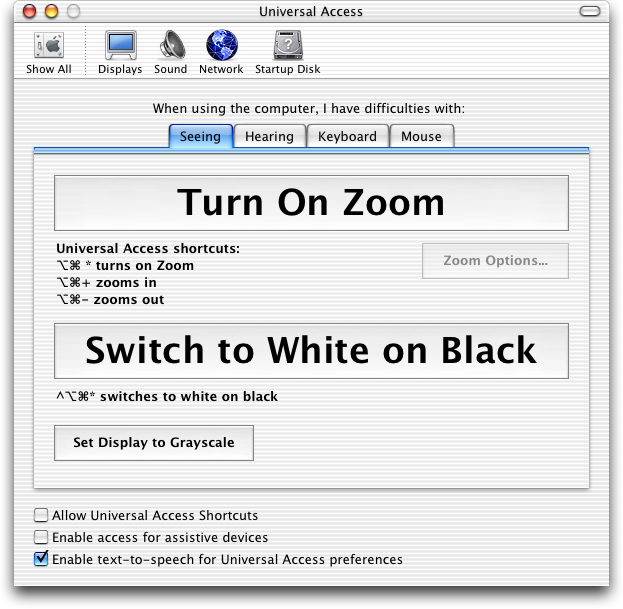 I mentioned to my sister that while her cool, awesome, totally righteous Macbook Air may fit her needs perfectly, there are many features and programs for differently-abled people that PCs offer for free. Ha! I thought I had her cornered! She started at me as if I were an alien. She immediately navigated me to the Universal Access panel, and looked very triumphant. I was honestly very impressed.